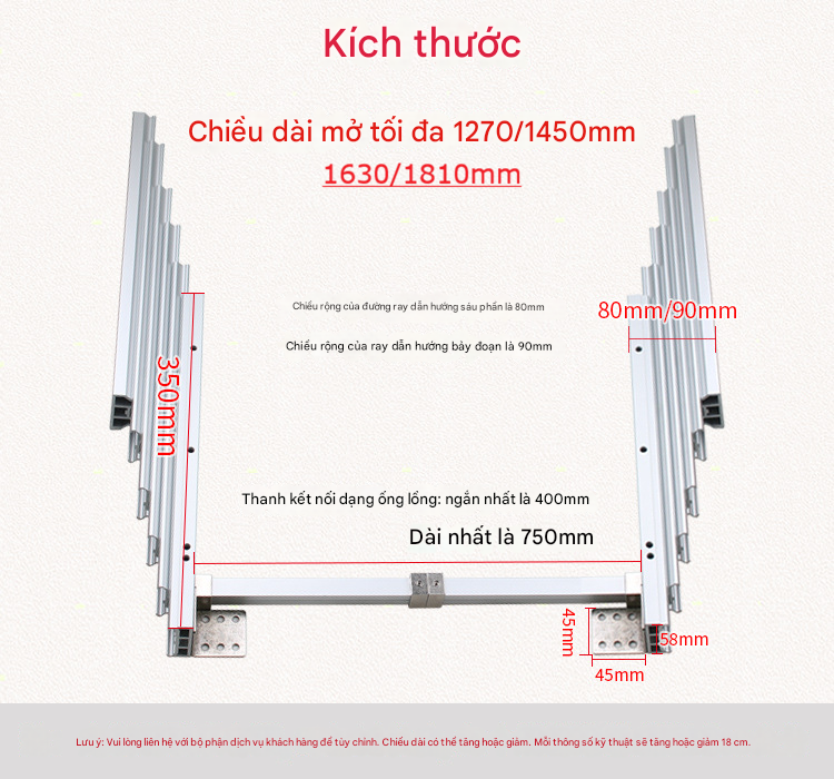 - Kích thước: 350 kéo dài 1270mm, 350mm kéo dài 1450mm, 350mm kéo dài 1630mm